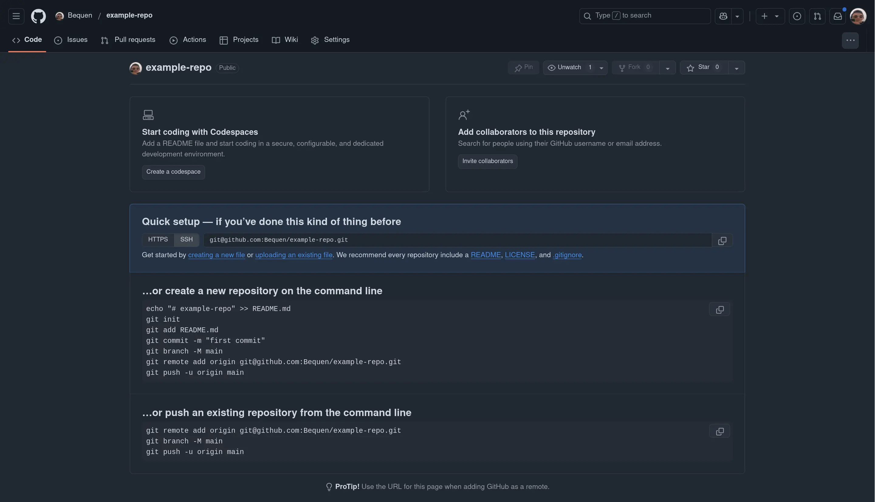 $ git remote add origin [email protected]:Bequen/example-repo.git